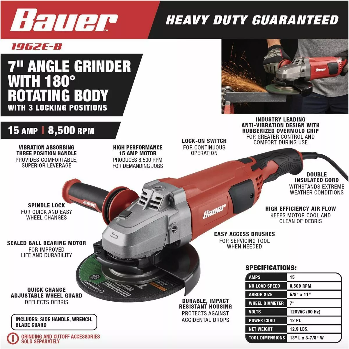 The BAUER™ 15 Amp 7 in. Trigger Grip Angle Grinder with 180° Rotating Body is built for versatility in general grinding and cutting applications. The 15 A motor produces 8500 RPM for grinding, cutting, and metal shaping applications. The 180° rotating body locks in three positions that match with the job. This angle grinder is an ideal choice for metalworking and concrete preparation.