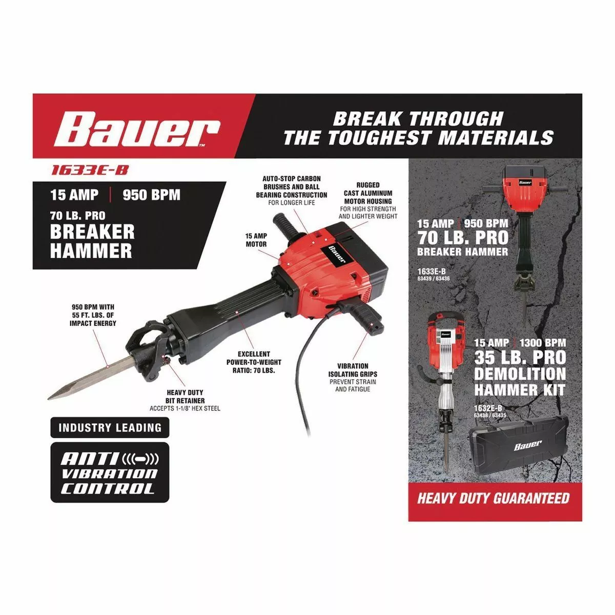 The BAUERβ’ corded 70 Lb. Breaker Hammer provides high efficiency with a 15 amp motor delivering 55 ft. lbs. of impact energy. The anti-vibration design plus rubber isolator grips reduce fatigue and help prevent strain during use. The heavy duty breaker hammer has an all ball bearing motor for long service life. Accepts both collared and collarless chisels.