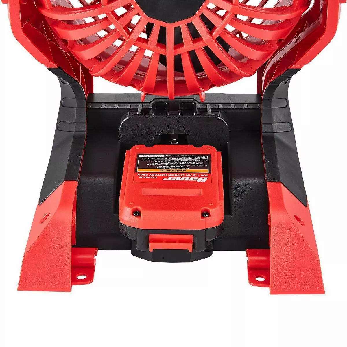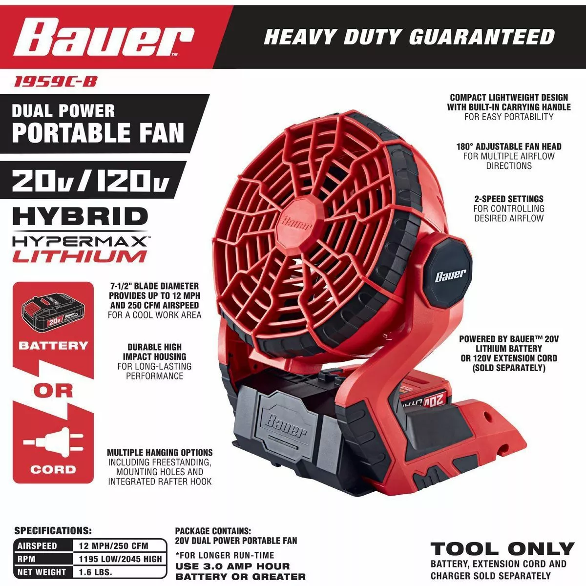 The BAUER™ Dual Power Fan is compact and easy to carry to the jobsite. This high-efficiency fan moves 250 CFM of air at speeds up to 12 MPH for a cool work area. Designed for use with a 20V BAUER™ lithium-ion battery, this compact fan can also be powered by a 120v extension cord. With two speed settings, a 180 ° adjustable head and multiple mounting options including a built-in rafter hook this fan delivers cooling where you need it most.