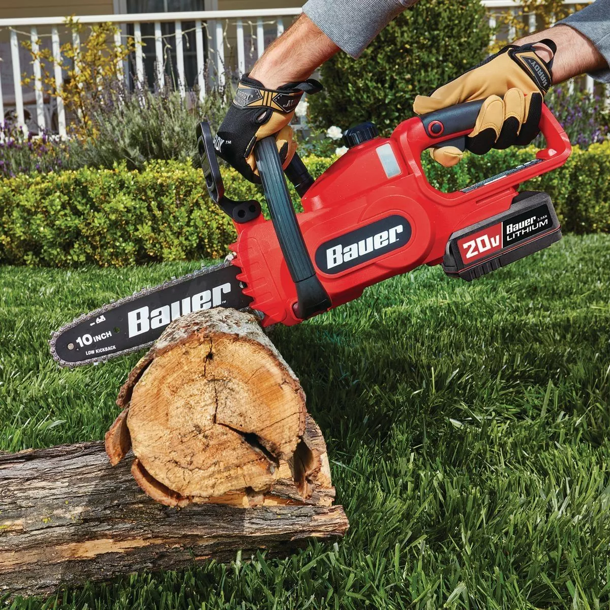 The BAUER™ 20V Cordless Chainsaw provides ample cutting power to tackle your daily cutting tasks. The 10 in. bar makes it ideal for trimming, pruning, and limbing with a 9 in. cut diameter to take on thick branches, trees and logs. Additional features like a hassle-free automatic chain oiler, lithium ion battery for longer runtime and a lightweight design that provides comfort and effortless operation.