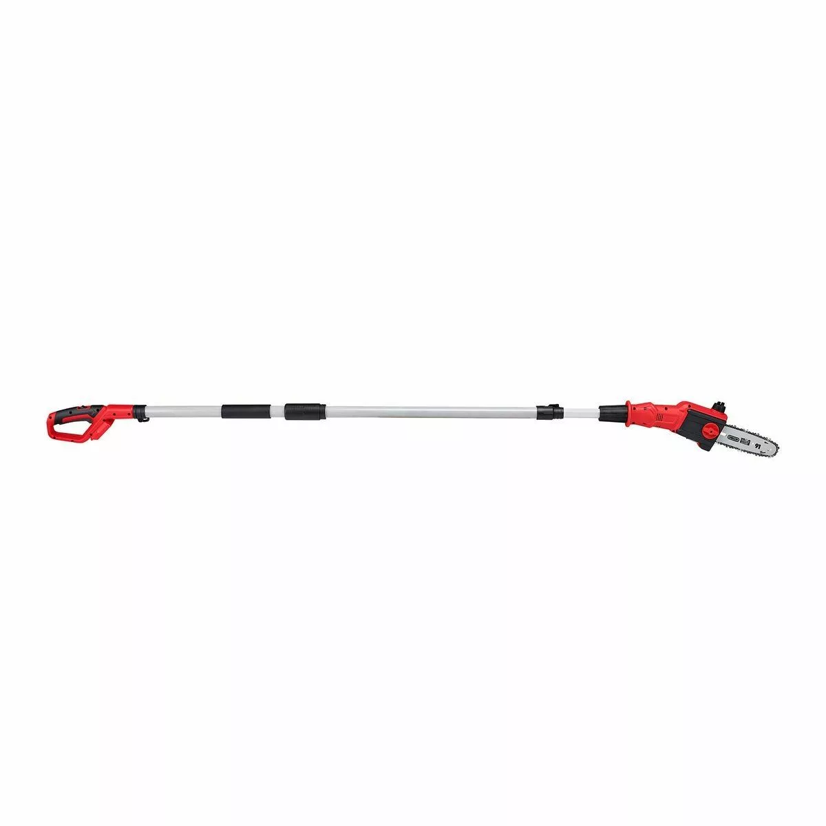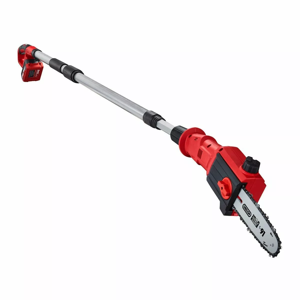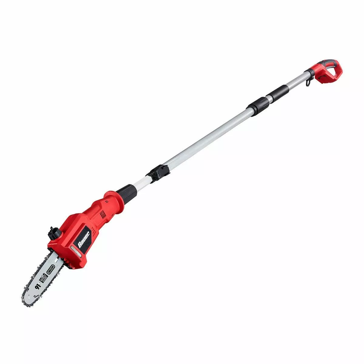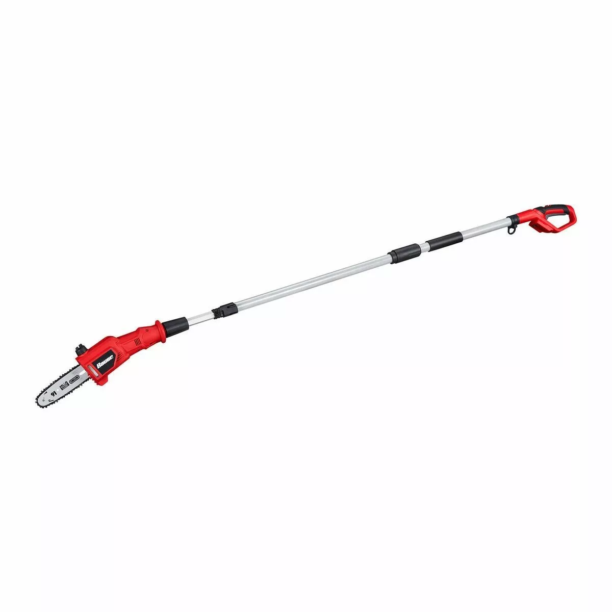 The BAUERâ„¢ 20V Cordless Pole Saw makes it easy to trim, prune, and cut large trees and bushes. The pole extends up to 9 ft. 3 in. for 14 ft. reach. Lightweight and well balanced, the angled cutting head provides better leverage and control when cutting high branches. The hassle-free automatic oiler makes this pole saw easy to use for quick jobs. The 8 in. low kickback bar and chain are the ideal length for trimming, pruning and limbing. Comes with a shoulder strap for added comfort and control.