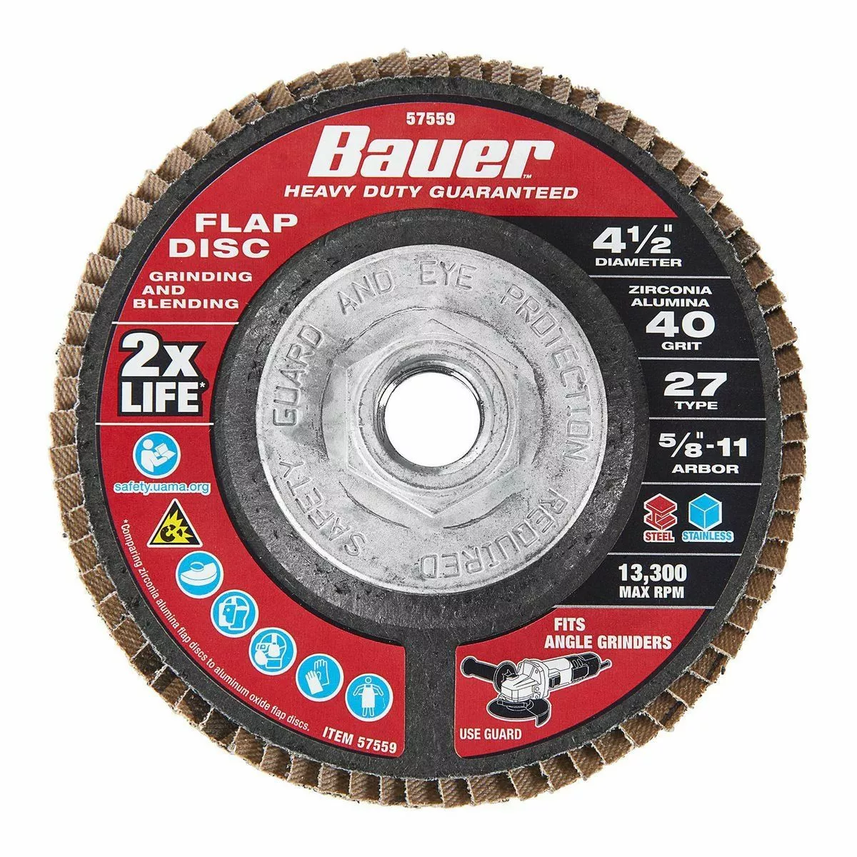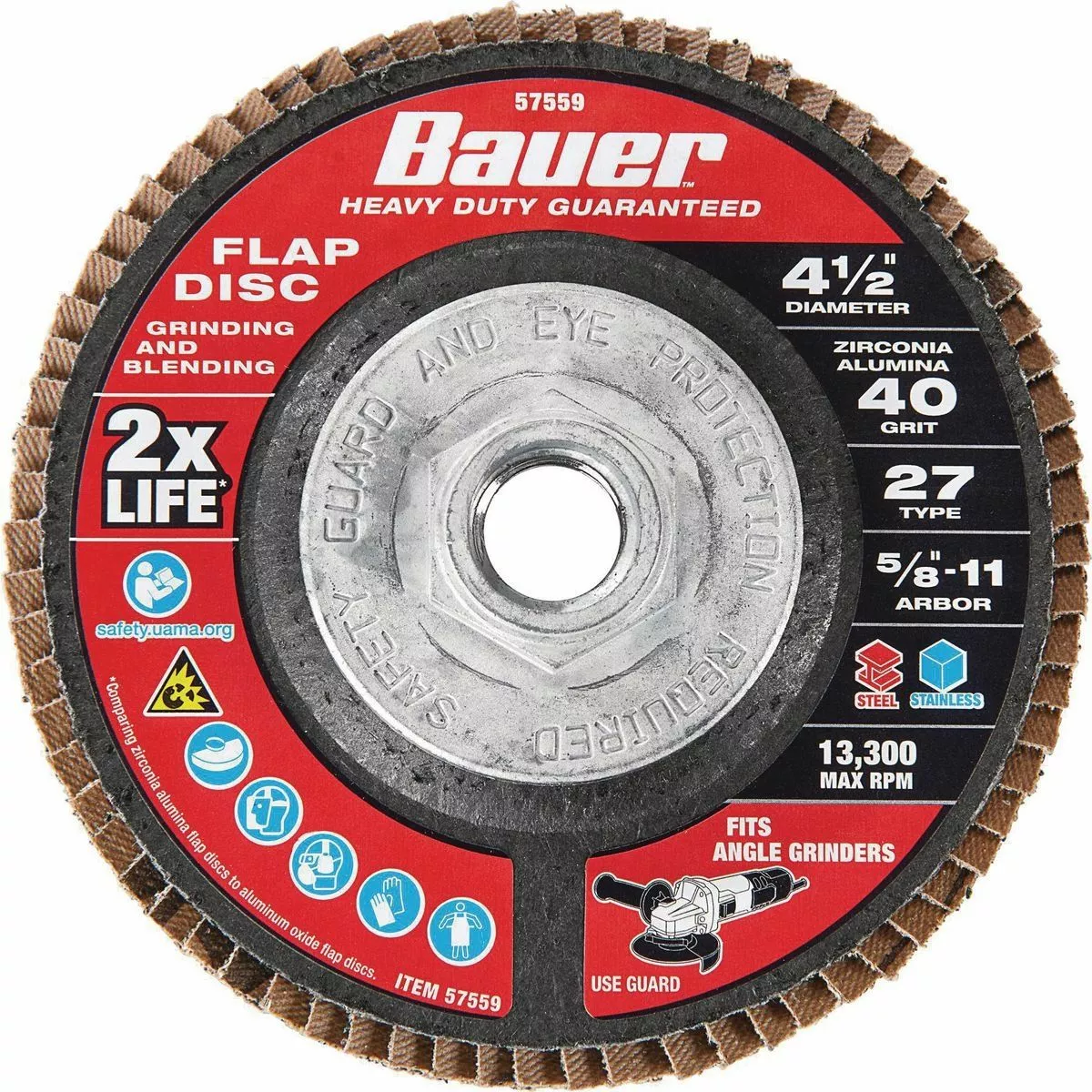 The BAUERâ„¢ 4-1/2 in. x 5/8 in.-11 40-Grit Type 27 Flap Disc is constructed with high quality Zirconia Alumina grain that lasts up to 2X longer* for fewer disc changes. Flexible flap plates conform to surfaces for grinding and blending on curves and contours. This disc delivers high performance on carbon steel and stainless steel applications.