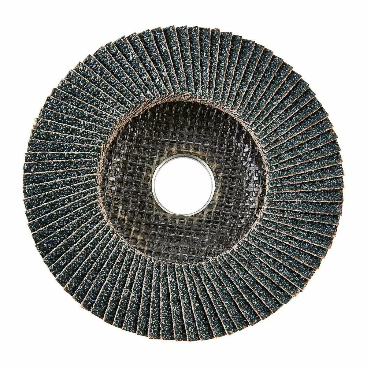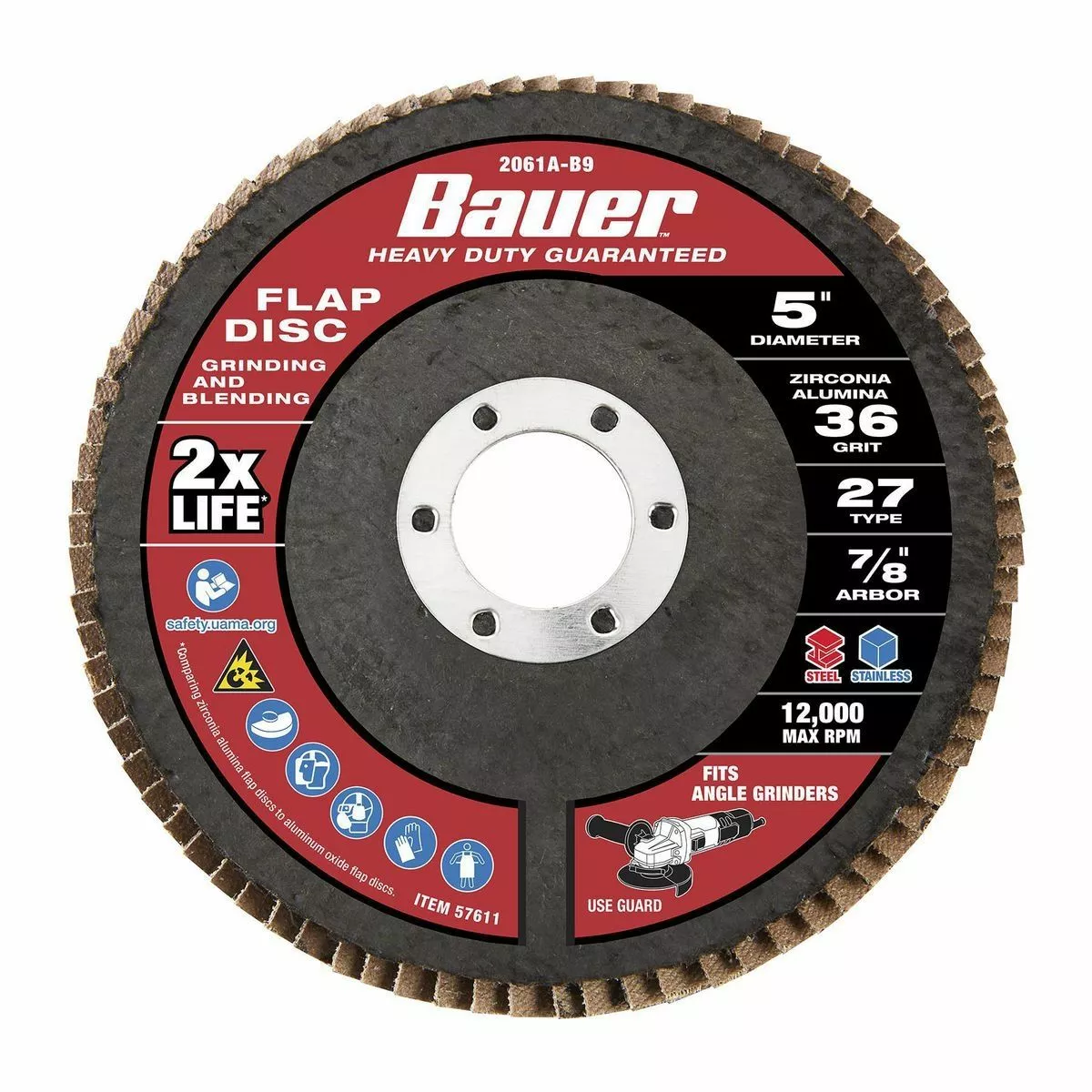 The BAUERâ„¢ 5 in. x 7/8 in. 36-Grit Type 27 Flap Disc is constructed with high quality Zirconia Alumina grain that lasts up to 2X longer* for fewer disc changes. Flexible flap plates conform to surfaces for grinding and blending on curves and contours. This disc delivers high performance on carbon steel and stainless steel applications.