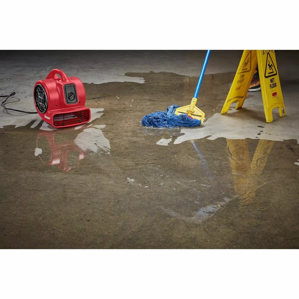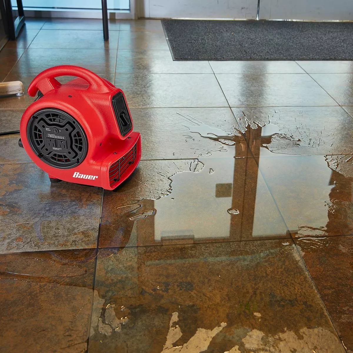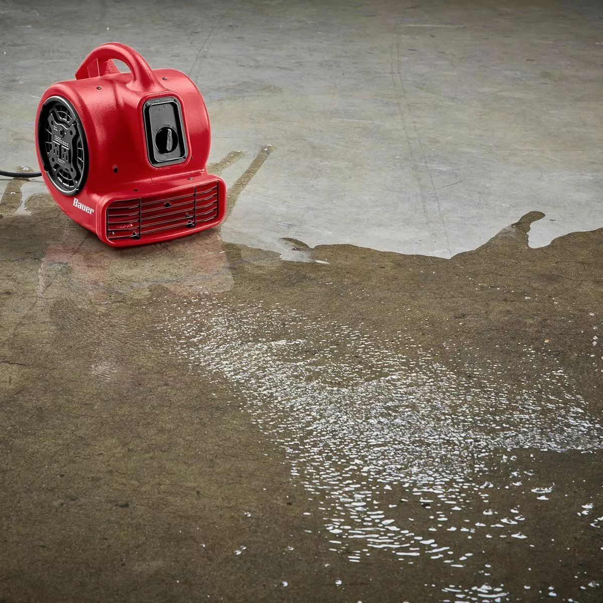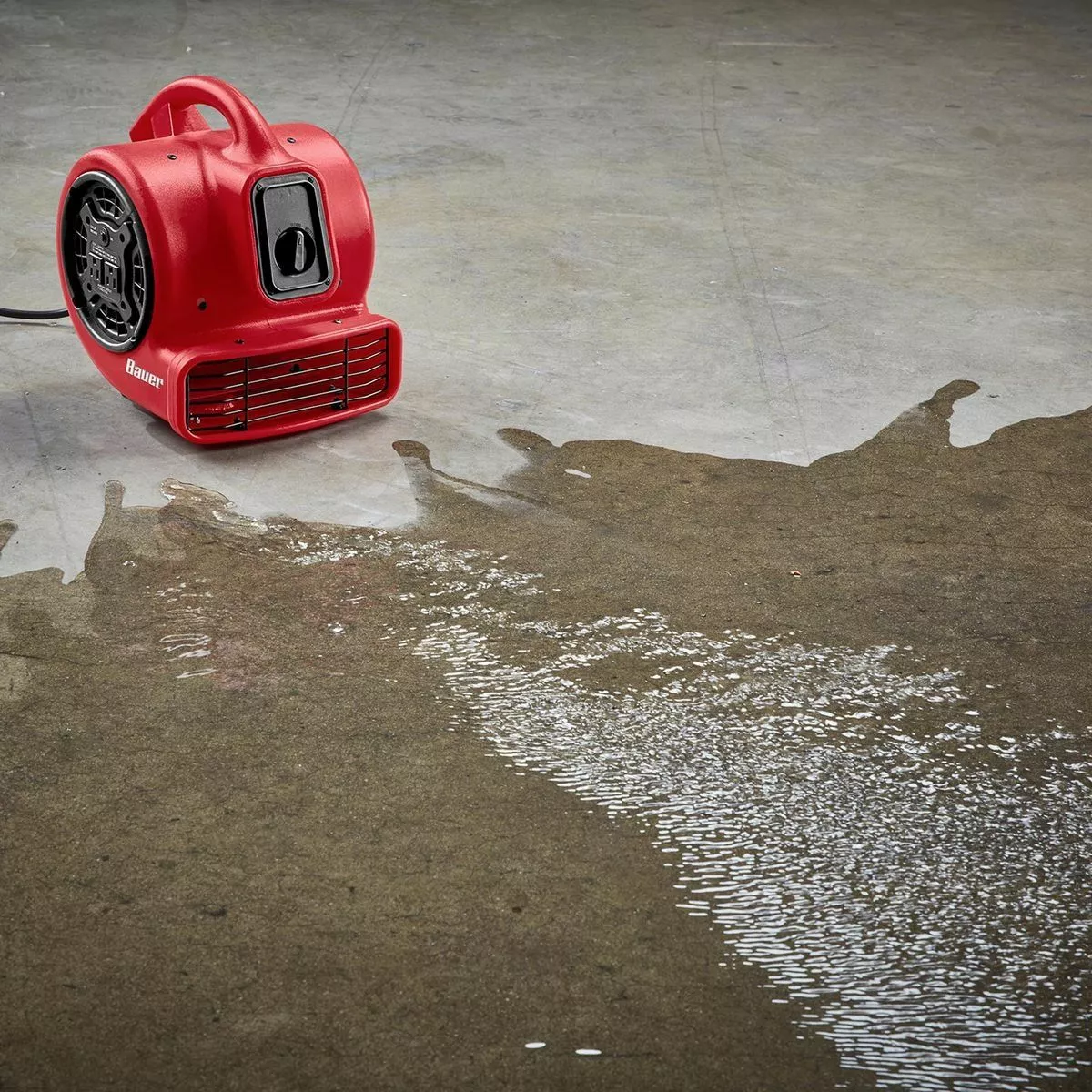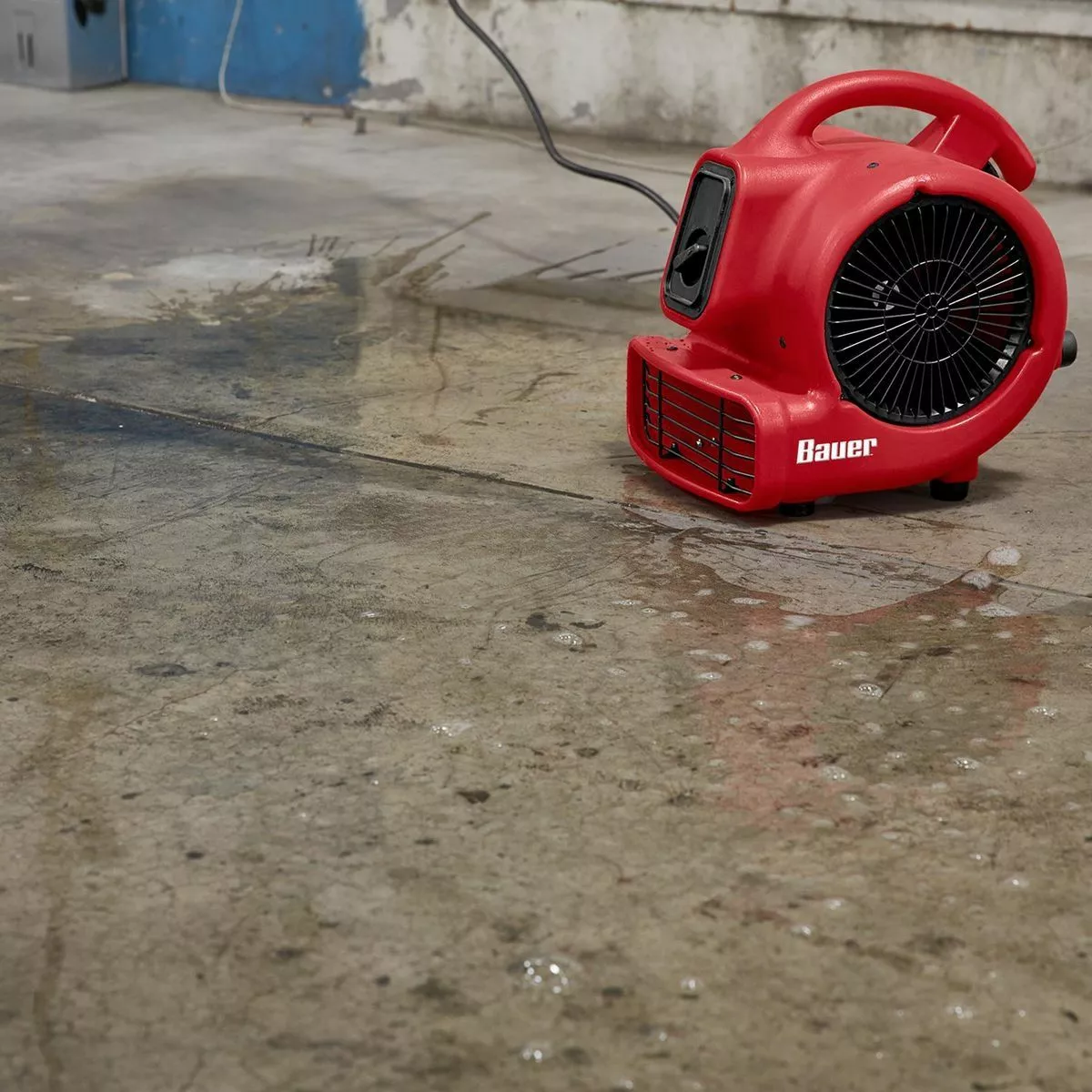 The BAUER™ 750 CFM 1/5 HP Floor Blower is designed to dry floors and carpet, ventilate closed spaces such as crawl spaces and attics, and circulate cooler air into overheated spaces. This 3-speed blower delivers up to 750 CFM and has an ergonomic handle, exhaust vent, and two protected 120v outlets for daisy-chaining multiple units. Three adjustable blowing angles (0°, 45°, 90°) provide versatility for ventilation, drying and cooling.