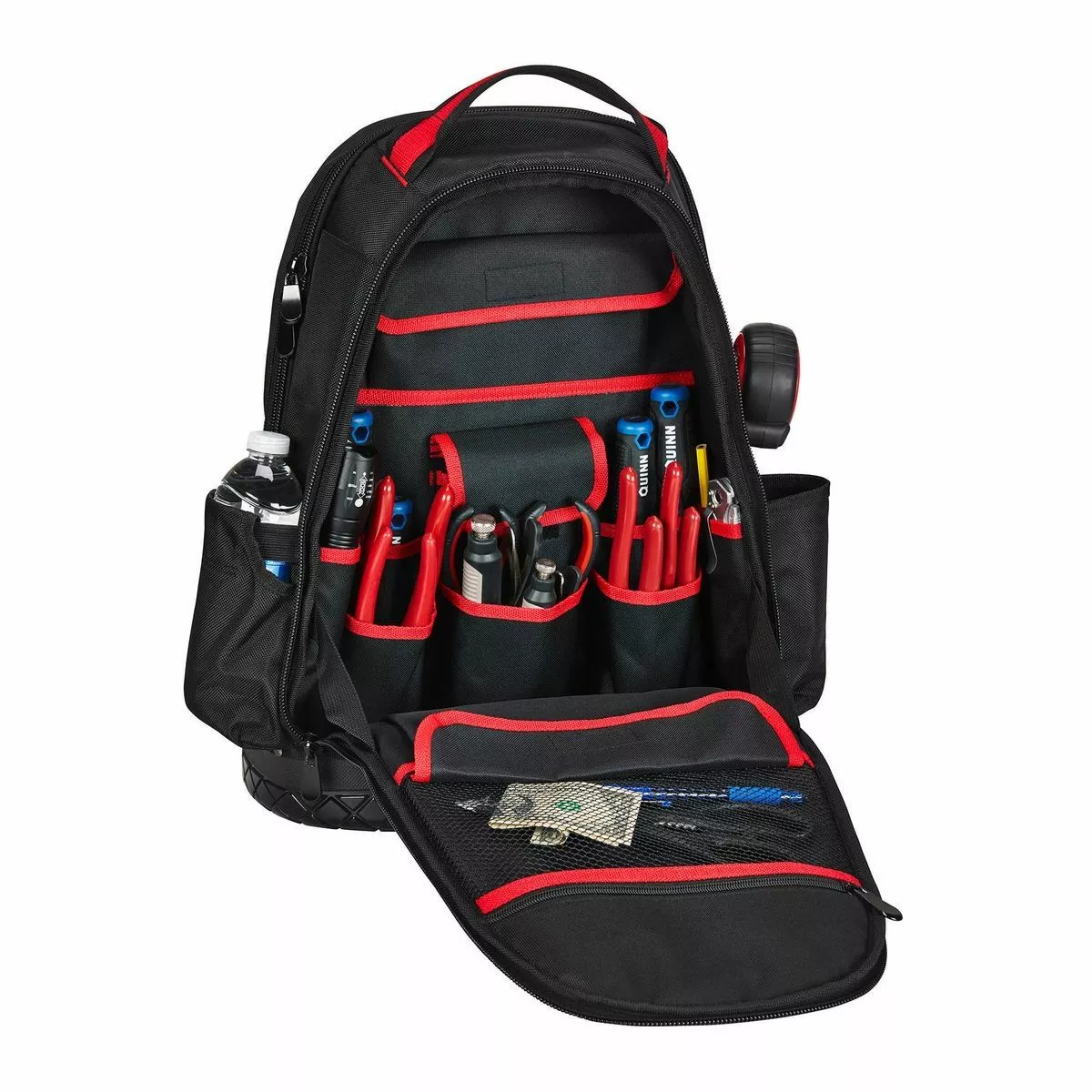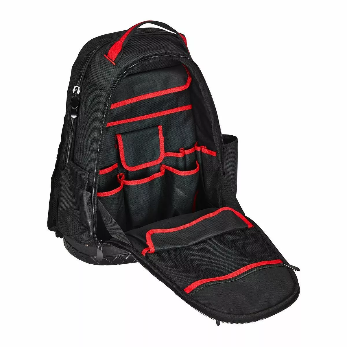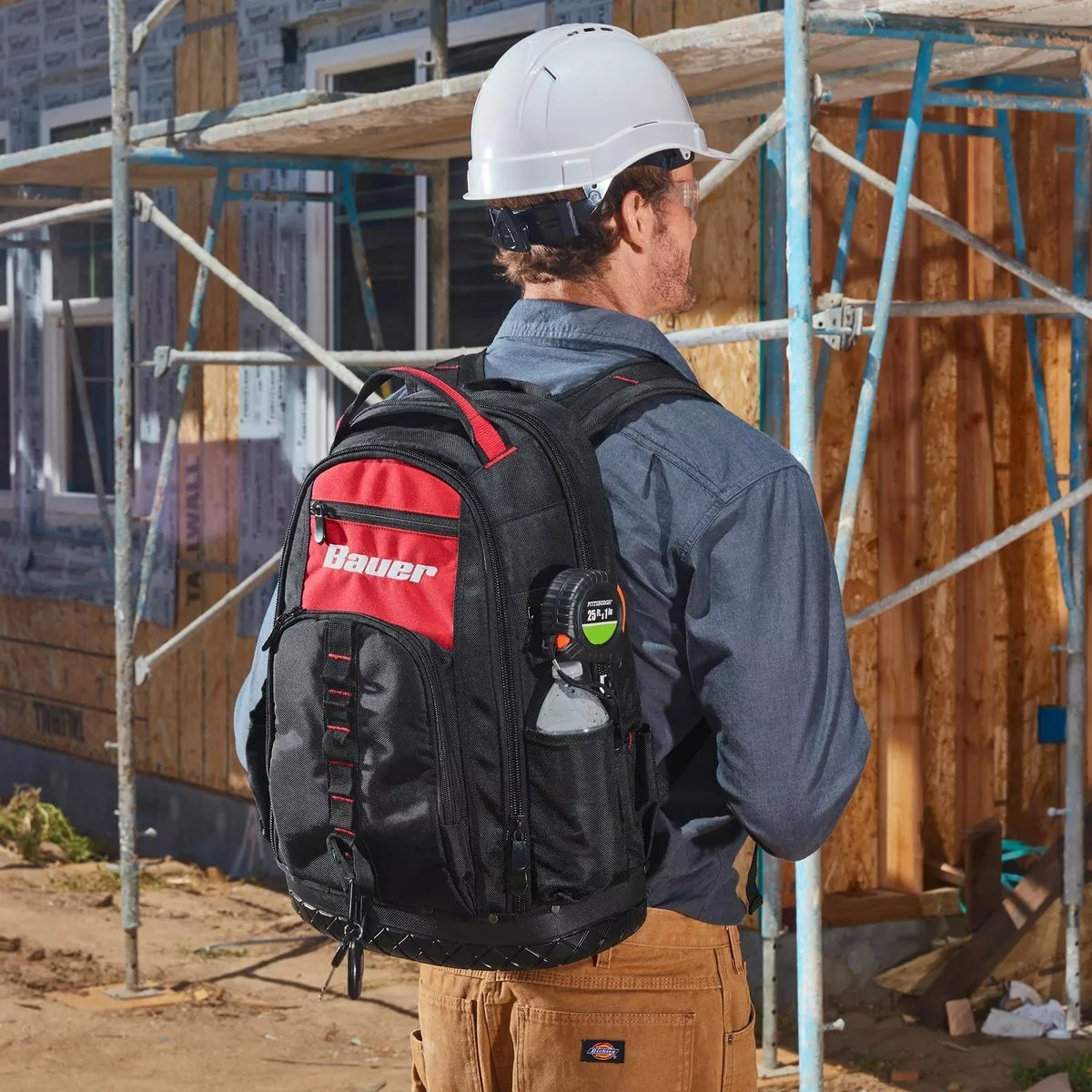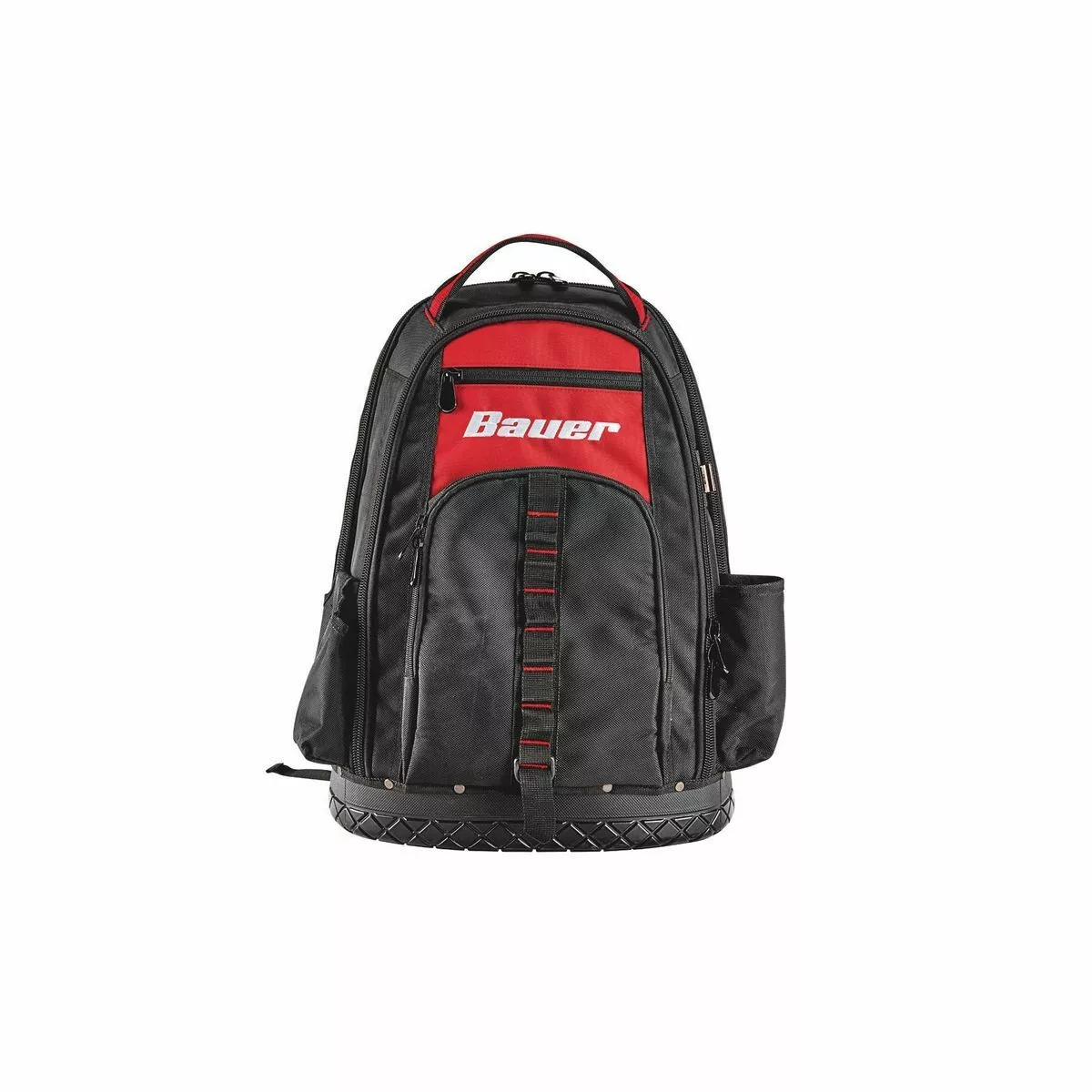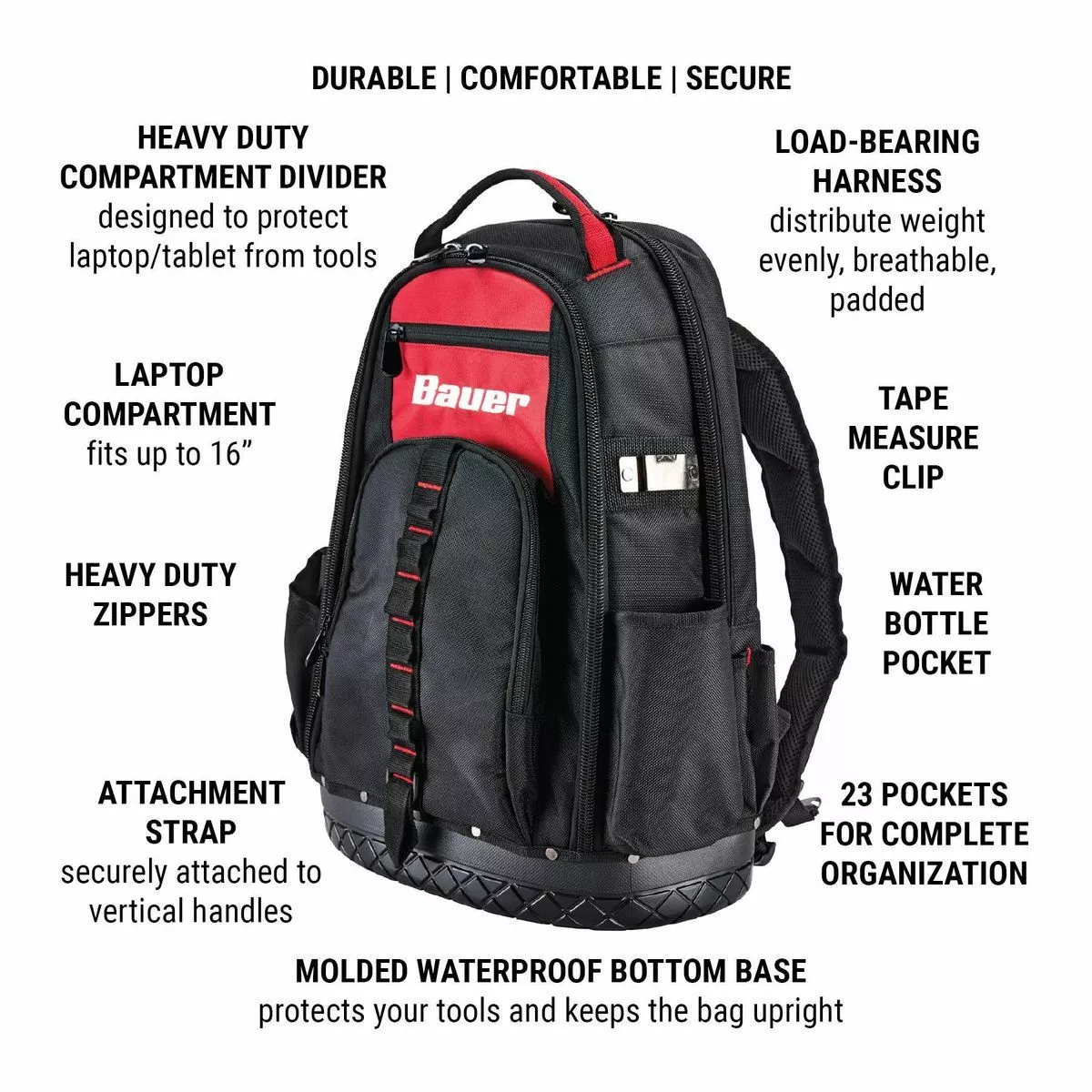 The BAUERâ„¢ 23 Pocket Heavy Duty Jobsite Backpack is constructed from extra tough 1680D Polyester for maximum strength and durability. The 23 pockets keep pliers, snips, wrenches, screwdrivers and other hand tools easily accessible. This backpack features an impact-resistant molded base that protects contents and keeps the backpack upright for easy loading. From the classroom to the jobsite, BAUERâ„¢ offers the perfect storage solution.