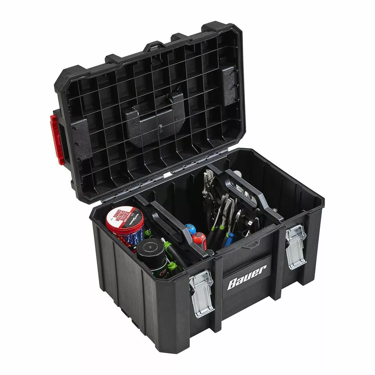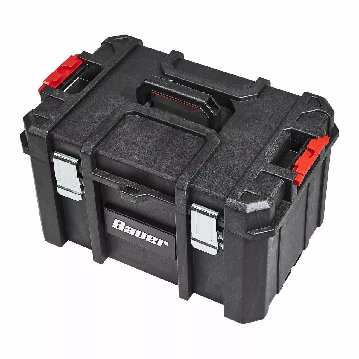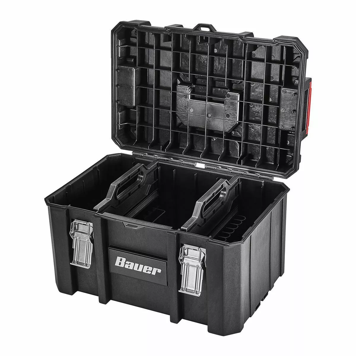 The BAUERâ„¢ Large Modular Toolbox is ideal for organizing tools. Made from high-impact resin, this toolbox has removable tool cards for organizing pliers, screwdrivers, and more. Strong metal latches keep tools secure during transport. With a 50 lb. weight capacity this toolbox is fully compatible the BAUERâ„¢ Modular Storage System. The organizer is IP65 rated for dust and water resistance. Customize your storage for quick access to essential tools.